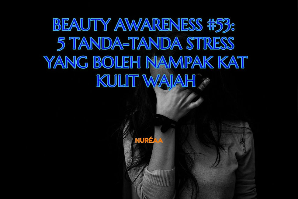 Hai korang! Hopefully, korang menjalani hari yang baik-baik sahaja. Kalau stress, boleh lakukan aktiviti fizikal macam bersenam ke, bersukan ke, atau pun hobi seperti melukis, membaca, atau sekurangnya keluar jumpa kawan-kawan dan tengok wayang. So, untuk post kali ini, Cik Jojo nak sharekan tentang 5 tanda-tanda stress yang clearly nampak kat kulit wajah. Jom check kot ada ciri-cirinya kat korang, if you do.. jangan lupa lakukan aktiviti untuk de-stress ya! 👉 Kulit kering Ini adalah tanda paling senang nak nampak. Ianya disebabkan oleh cortisol hormone yang tak dapat membantu untuk mempertahankan kelembapan kat kulit wajah. Maksdunya kat sini, korang memang jenis kulit normal contohnya, tiba-tiba berubah jadi kulit kering padahal rutin penjagaan dah dilakukan. So, stress mungkin salah satu sebabnya. Jangan lupa check tau. 👉 Kerutan kat wajah Bila kita stress, ianya senang mempengaruhi otak kita dan menjadikan process penuaan lebih cepat daripada sepatutnya. Jika ini terjadi, garis kerutan kat dahi, mulut dan mata senang nak nampak. 👉 Lingkaran hitam bawah mata Lingkaran hitam bawah mat ani berlaku banyak sebab seperti tak cukup tidur, genetic, dan termasuklah stress. Bila dah selalu sangat stress, maka masalah tidur pun timbul. Bila tak cukup tidur, itulah yang menyebabkan masalah lain termasuklah masalah kesihatan, kulit wajah dan kulit di bawah mata menjadi kendur dan nampak bengkak. Cik Jojo selalu pesan tidur yang cukup adalah penting selain minum air kosong banyak. Fungsi tidur tu ialah merehatkan badan kita yang dah seharian bekerja. So, kalau tak tidur atau tak cukup tidur, tidakkan kita memaksa atau memberikan stress/tekanan kepada badan kita? Fikirkan. 👉 Wajah selalu nampak lesu Bila stress terjadi ia juga dapat merencatkan produksi melanin dan kalogen kulit kita tau. Bila produksi kalogen ternganggu, so dia tak dapatkan berikan keanjalan kat kulit. Hasilnya, nampak lah kulit kita tu sedihkit kusam daripada biasa, dan tak glow. Ya lah dah stress, mood kita pun suram jeeee kan. So, carilah cari untuk atasi masalah stress. Ingat tau, semua orang ada mengalami stress, carilah penyelesaian yang sewajarnya. Jika tidak jump acara mengatasi, jangan lupa dapatkan khidmat mereka yang professional. 👉 Rambut banyak gugur OMG, yang ni memang senang nak jumpa. Cik Jojo rasa, mostly kita kat sini mengalaminya. Bila stress, baru perasan rambut banyak gugur then kita cemas. Kalau korang nak tau, stress ni dapat menjadikan folikel rambut pramatang dan seterusnya tergugur dengan sendirinya. So, secara ringkasnya… masalah yang korang ada kat kulit wajah tu, may be juga disebabkan oleh STRESS. Jika ianya terjadi, jangan lupa cari penyelesaian dan cuba jauhi daripada terus berfikir tentang stress tersebut ya. Kalau tak mampu juga mencari aktiviti yang dapat mengatasi stress, segeralah dapatkan rawatan atau bantuan mereka yang professional. Kalau korang suka atau suka sangat post ini, jangan lupa ke facebook page NURÉAA dan berikan #LIKE atau #LOVE. Klik #SHARE supaya ramai boleh dapat manfaat mengenai post ini. Terima kasih korang dan selamat malam! Jumpa esok ya!